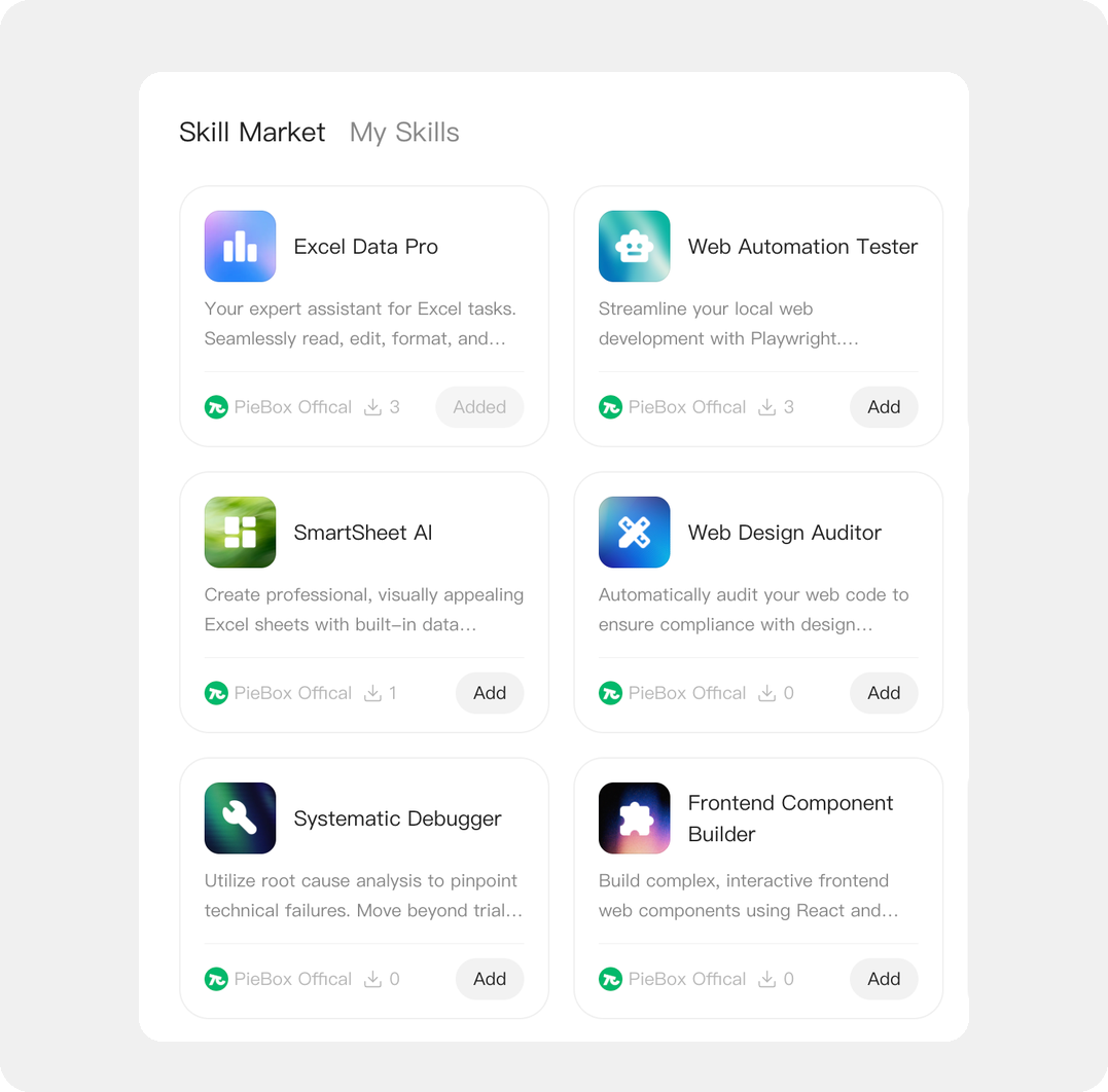 Visual design, data analysis, bug fixes — hundreds of expert skills, one click to load.